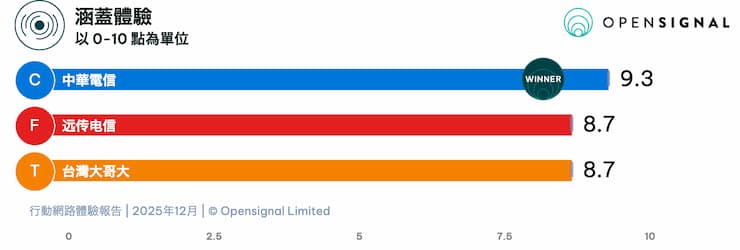 著名な通信品質分析企業であるイギリスのOpensignalの評価によると、2025年12月の時点で人口カバー率は中華電信が10点満点の9.3ポイント、台湾大哥大と遠傳電信がともに8.7ポイントでした。